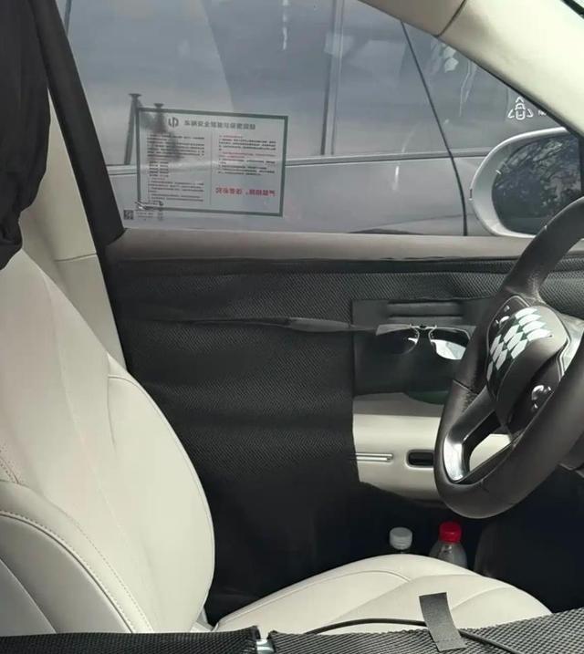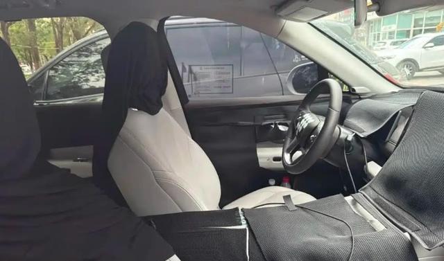 从内饰谍照可以看到大部分都做了遮盖处理,但从细节依然可以看到新车配备了长条形仪表屏+悬浮式大尺寸中控屏。方向盘采用极简滚轮按键+双侧功能键,门把手为电子开启式,座椅为白色厚填充设计,突出豪华感。